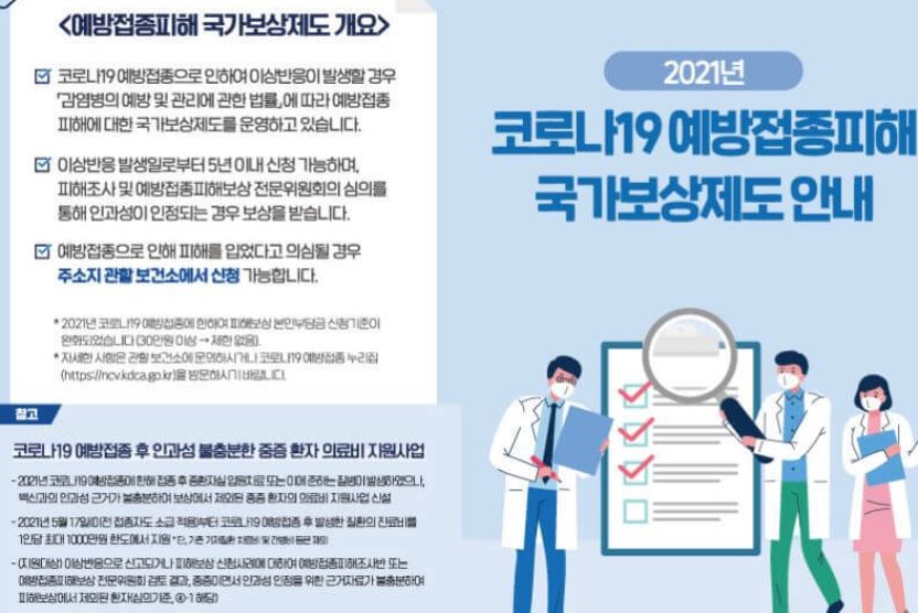 지원의 종류는 진료비 및 정액간병비. 장애인 일시 보상금, 사망 일시보상금 및 장제비 입니다. 예방접종으로 인해 피해를 입었다고 의심되는 경우에는 주소지 관할 보건소에서 피해보상을 신청할 수 있습니다.
