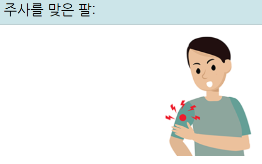 일반적인 부작용으로는 주사를 맞은 팔의 통증, 부어오름이 있을 수 있습니다. 이 불편함을 줄이려면 깨끗한 수건을 차갑게 적셔 해당부위에 덮기 또는 가볍게 팔을 움직여주도록 합니다.